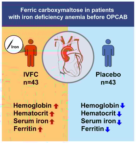 Patients scheduled for cardiac surgery often have anemia and iron deficiency. We investigated the effect of the preoperative administration of intravenous ferric carboxymaltose (IVFC) in patients with iron deficiency anemia (IDA) who were due to undergo off-pump coronary artery bypass grafting (OPCAB). Patients who were due to undergo elective OPCAB between February 2019 and March 2022 who had IDA (n = 86) were included in this single center, randomized, parallel-group controlled study. The participants were randomly assigned (1:1) to receive either IVFC or placebo treatment. Postoperative hematologic parameters [hemoglobin (Hb), hematocrit, serum iron concentration, total iron-binding capacity, transferrin saturation, transferrin concentration, and ferritin concentration] and the changes in these parameters during the follow-up period were the primary and secondary outcomes, respectively. The tertiary endpoints were early clinical outcomes, such as the volume of mediastinal drainage and the need for blood transfusions. IVFC treatment significantly reduced the need for red blood cell (RBC) and platelet transfusions. Despite receiving fewer RBC transfusions, patients in the treatment group had higher levels of Hb, hematocrit, and serum iron and ferritin concentrations during weeks 1 and 12 after surgery. No serious adverse events occurred during the study period. Preoperative IVFC treatment in patients with IDA undergoing OPCAB improved the values of the hematologic parameters and iron bioavailability. Therefore, is a useful strategy for stabilizing patients prior to OPCAB.