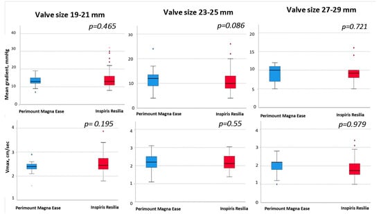 Sub-analysis related to the size-category reported no statistical differences between the PME and IR valves in relation to the Gmean (19–21 mm: 13.1 ± 3.1 mmHg vs. 15.4 ± 6.4 mmHg, p = 0.2; 23–25 mm: 11.6 ± 3.6 mmHg vs. 10.8 ± 4.4 mmHg, p = 0.08; 27–29 mm: 9.0 ± 2.2 mmHg vs. 9.31 ± 2.70 mmHg; p = 0.7, for PME and IR respectively) or Vmax (19–21 mm: 2.4 ± 0.32 mmHg vs. 2.58 ± 0.43 mmHg, p = 0.1; 23–25 mm: 2.22 ± 0.42 mmHg vs. 2.17 ± 0.39 mmHg, p = 0.5; 27–29 mm:1.98 ± 0.27 mmHg vs. 1.97 ± 0.33 mmHg; p = 0.9, for PME and IR respectively), for any size-category (Figure 2).