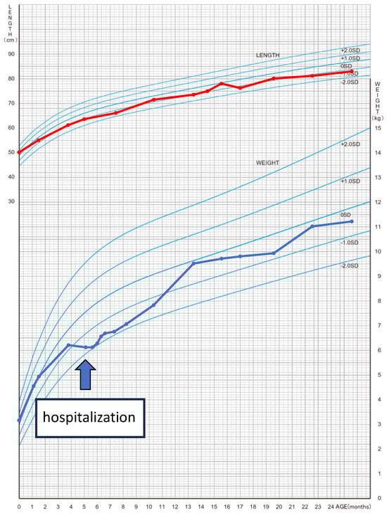 The patient was a 5-month-old boy. He was born at 39 weeks and 3 days by normal vaginal delivery, with a birthweight of 3144 g and Apgar scores of eight points at 1 min and nine points at 5 min after an uncomplicated pregnancy. He had no previous or family history of any illness. He had been losing weight for 2 months prior to admission (Figure 1). One month before hospital admission, he developed a wet cough that did not improve with any medication, and wheezing was also observed. Five days before hospital admission, the patient had poor feeding, and the local clinic noted tachycardia with a rate of 190 beats per minute (bpm). Steroids were prescribed for the wheezing, but these symptoms did not improve. On the day of hospital admission, a chest X-ray showed an enlarged cardiothoracic ratio, and an echocardiogram showed reduced LV contraction. The patient was urgently transferred to our hospital.