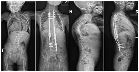 - Grabala, P.; Kowalski, P.; Rudziński, M.J.; Polis, B.; Grabala, M. The Surgical Management of Severe Scoliosis in Immature Patient with a Very Rare Disease Costello Syndrome-Clinical Example and Brief Literature Review. Life 2024, 14, 740. [Google Scholar] [CrossRef]