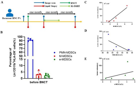 Association between MDSC population and tumor size in patients with recurrent HNC before treatment. (A) The schedule of the therapeutic process. (B) MDSC population in patients with recurrent HNC. Correlations between tumor volume and (C) M-MDSCs, (D) PMM-MDSCs, and (E) e-MDSCs. Correlation analysis was fitted with a simple linear regression.