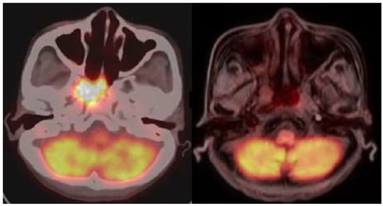 Imaging results for patient 5. (Left) The positron emission tomography (PET)/computed tomography (CT) image of patient 5 was taken before BNCT treatment. (Right) The PET/magnetic resonance imaging (MRI) scan displayed tumor recurrence in patient 5 following the complete treatment for three months.