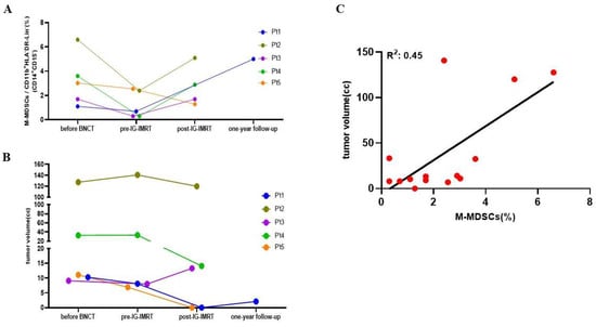 When the level of circulating M-MDSCs one month after the completion of the last IG-IMRT was analyzed (Figure 3A), the M-MDSC levels in three patients increased (patients 2, 3, and 4), and in one patient, the level decreased further (patient 5). Patient 1 attained a complete response at the pre-IG-IMRT time, and we failed to detect the level of MDSCs. Although patient 1 had a CR one month after the therapeutic process, the M-MDSCs increased in the 1-year follow-up period. A recurrent tumor was then noted at the treatment site. When the correlation between the level of M-MDSCs and the tumor volume of these four patients at this time point was analyzed, a linear correlation was observed with R2 = 0.89 (Supplement Figure S1) despite the lack of statistical significance due to the low patient number. However, these data suggest a correlation between the tumor volume and M-MDSC levels in recurrent HNC patients. The results revealed a good correlation between the M-MDSC level and tumor size with the goodness of fit having an R2 value of 0.85, with the data from patients before BNCT and one month after the last fraction of IG-IMRT. If all data from pre-treatment, pre-IG-IMRT, and post-treatment were analyzed, the goodness of fit decreased to 0.45 (Figure 3C). Nevertheless, these results indicated that M-MDSC levels were significantly associated with tumor progression in patients with recurrent HNC, not only before BNCT but also after IG-IMRT.