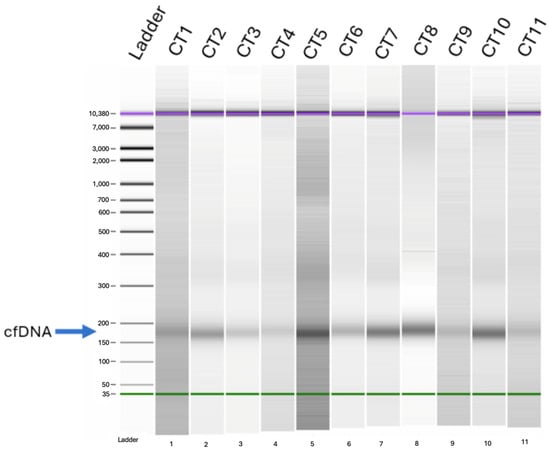 cfDNA quality assessment via capillary electrophoresis. DNA isolated from plasma samples was separated based on the fragment size. Lane L contains a DNA ladder, and lanes 1–11 contain extracted DNA. Samples have signal peaks corresponding to DNA fragments of 150–200 bp, which is the range consistent with cfDNA. Purple line corresponds to the highest size on the DNA ladder, green line corresponds to the lowest size on the DNA ladder.