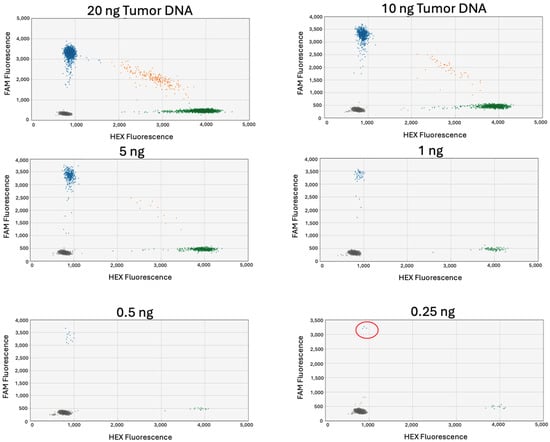 Tumor DNA diluted in water. ddPCR conducted on serial diluted samples of tumor DNA in water from 20 ng down to 0.25 ng. In these figures, the x-axis represents the intensity of the HEX fluorescence (corresponding to the wild-type probe), and the y-axis represents the intensity of the FAM fluorescence corresponding to the mutant probe). Thus, the green cluster represents the population of droplets containing the wild-type allele, and the blue cluster represents the population of droplets containing the mutant variant allele. The orange cluster represents the double positive population meaning that the droplets contained both the mutant and wild-type allele. Variant allele can be detected with as little as 0.25 ng tumor DNA as indicated in the red circle. The case used in this example is RT-7418; primers and probes targeted an SNV in the gene SEMA5A.