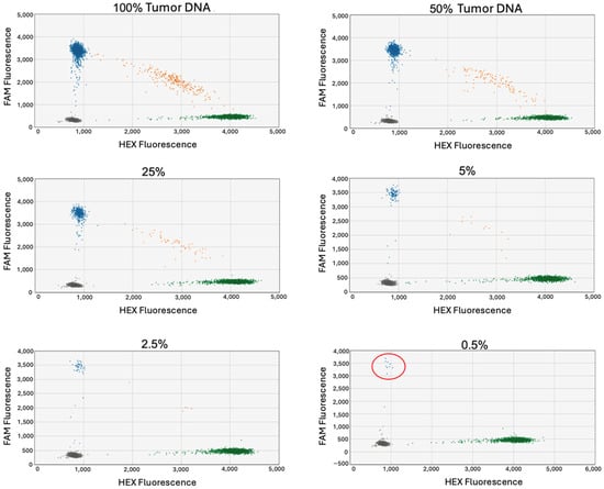Prior to testing the cfDNA samples, sensitivity assays were conducted using tumor and blood DNA to determine the limits of detection of mutant DNA for each case. These assays have previously been described by our group, as well as others [,]. The first sensitivity assay was performed by serially diluting the tumor DNA in water such that the concentrations of DNA analyzed via ddPCR were between 20 ng and 0.25 ng. The goal of this assay was to determine the minimum amount of input DNA needed to detect a mutation.