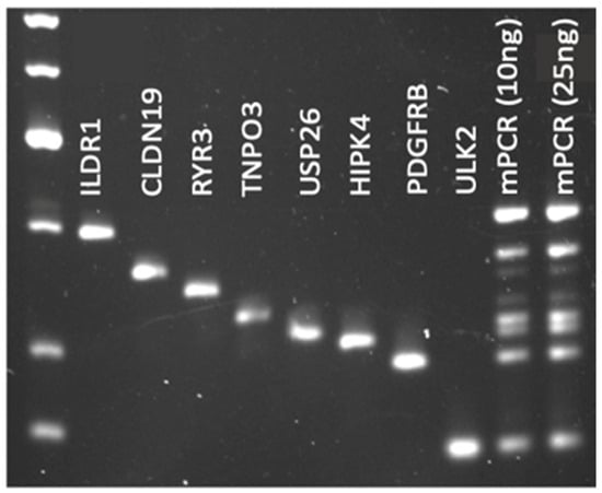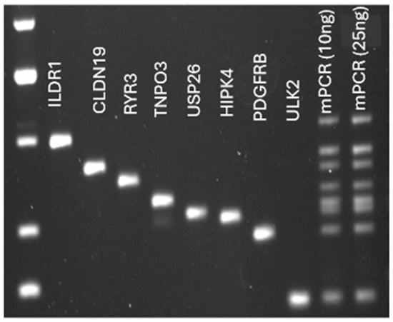 Optimized mPCR conditions. Agarose gel depicting mPCR for case RT-7860. Lane 1 contains the DNA ladder. Lanes 2–9 contain the individual amplicons from singleplex PCR. Lanes 10 and 11 contain the mPCR product using either 10 ng or 25 ng of input DNA, after optimizing the primer amount and reaction conditions for this case. Here, each sequence was amplified with equal intensity.