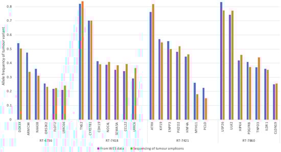 Tumor variant sequences detected via mPCR-amplicon sequencing. Results of sequencing the amplicons generated from tumor DNA for all cases show that the variant allele frequencies from WES and the targeted amplicon sequencing were similar. The results are based on the detection of variant alleles that were identified via WES of the tumor DNA. The x-axis shows each amplicon sequence, and the y-axis is the allele frequency of the tumor variant. The blue bars represent the variant allele frequency as determined via the whole-exome sequencing of tumor and blood DNA; the orange bars represent the frequency of the tumor variant in the mPCR products generated from tumor DNA.