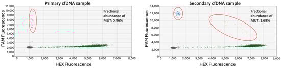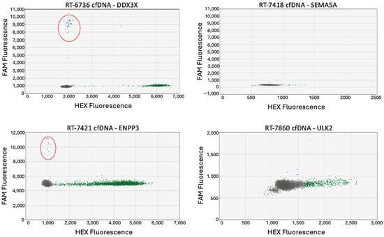 cfDNA assays were conducted according to previously optimized ddPCR conditions. The detection of tumor-specific SNVs in cfDNA samples indicated the presence of ctDNA in patient plasma. For each case, between 5 ng and 15 ng of cfDNA was utilized for ddPCR.