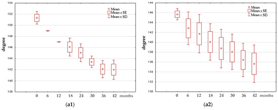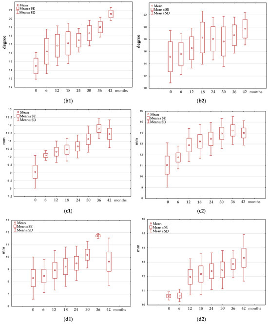 Example of box-and-whisker plots illustrating changes in the investigated parameters over the specific time periods for group III: (a1,a2)—roof angle (D) in the group of girls and boys, respectively; (b1,b2)—slope angle β in the group of girls and boys, respectively; (c1,c2)—lateral tubercle height (LTH) in the group of girls and boys, respectively; (d1,d2)—medial tubercle height (MTH) in the group of girls and boys, respectively; (e1,e2)—tibial width (TW) in the group of girls and boys, respectively.
