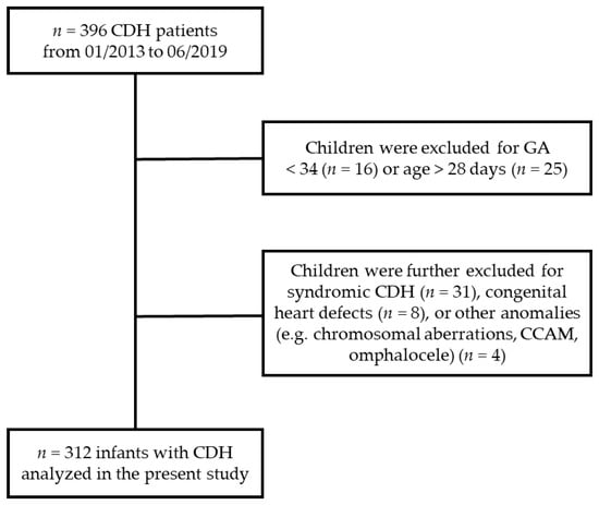 Between January 2013 and June 2019, 396 neonates with CDH were treated at our center, of which, 312 neonates were included in this study. For an overview of the recruitment of the study population and the characteristics of the dropouts, please see Figure 1. The enrolled study population consisted of 266 patients (85.3%) with left-sided and 46 patients (14.7%) with right-sided CDH. Chylothorax occurred in 58 (18.6%) of all CDH cases, 20.3% in LCDH and 8.70% in RCDH (p = 0.07). PE was frequently observed as a postsurgery complication (71.5%) but did also occur as a pre-existing condition. Overall survival was 82% for LCDH and 85% for RCDH, respectively. For a more detailed overview of the characteristics of the study population, please refer to Supplemental Table S1.