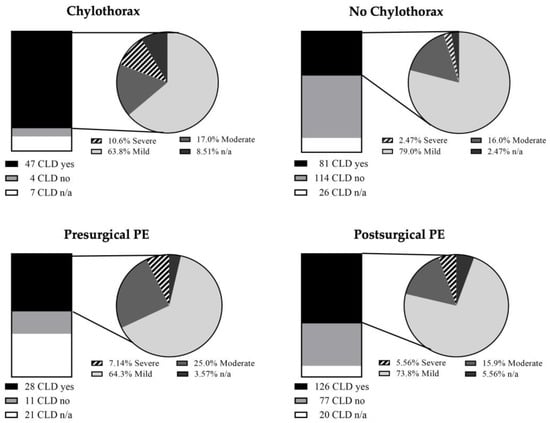 The diagnosis of CLD was performed as reported before [,]: if there was an additional need for oxygen supplementation on day 28 after birth, CLD was diagnosed. The severity of CLD was differentiated into three grades according to the additional need for oxygenation on day 56 after birth: mild CLD with no need for supplemental inspired oxygen (fraction of inspired oxygen (FiO2) ≤ 0.21), moderate CLD (FiO2 0.22–0.29) and severe CLD (FiO2 ≥ 0.30). Chylothorax was defined by elevated triglycerides > 100 mg/dL and cell count > 1000 per µL predominantly showing lymphocytic differentiation (>50%) in drained effusion fluid and primarily treated conservatively. If chylus flowrates exceeded 30 mL/kg body weight/day, somatostatin administration via continuous infusion was initiated according to the following protocol: 5 µg/kg/h on day 1, 7.5 µg/kg/h on day 2, 10 µg/kg/h on day 3 and ongoing for 14 to 21 days depending on persisting chylus flow rates. Chest tube insertion to treat PEs was not routinely performed during or after surgery. To assess whether chest tubes were required during the postoperative period, the effusion volumes detected via ultrasound, chest radiography and blood gas analysis were taken into consideration. On a chest X-ray, a PE must have led to the collapse of the ipsilateral lung, thus leading to separation from the thoracic wall and/or to midline shift accompanied by the impaired ventilation of oxygenation for chest tube insertion to be performed. Once put in, chest tubes were kept in place for another two days after their flowrate declined to a minimum.