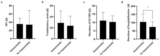 Comparison of outcome parameters of children undergoing somatostatin therapy of chylothorax. No significant differences could be determined regarding the duration of mechanical ventilation (MV) (a), the duration of subsequent ventilatory assistance with spontaneous breathing (b) or extracorporeal membrane oxygenation (ECMO) (c). Somatostatin therapy significantly increased the total duration of hospitalization of survivors (d). Data are presented in means ± SD. * p < 0.05.