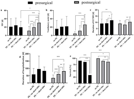 Outcome parameters of children with and without presurgical or postsurgical effusions (Pes) and with and without chest tube insertion, respectively. Duration of mechanical ventilation (MV) (a), subsequent ventilatory assistance with spontaneous breathing (b), duration of ECMO (c), duration of hospitalization of survivors (d) and survival (e) were measured and compared according to the presence of PE or chest tubes, respectively. Data are presented in means ± SD. Survival is given as percentages based on the respective study group population. * p < 0.05, ** p < 0.01, *** p < 0.0001.