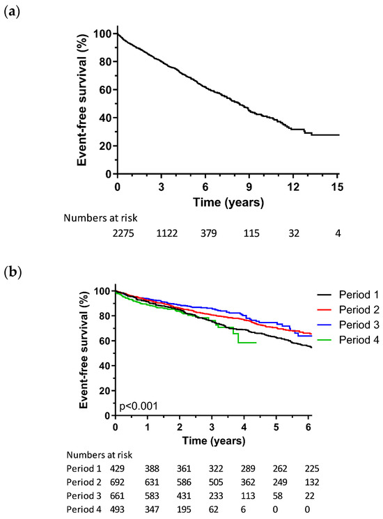Over the last two decades, CRT has become one of the cornerstones of treatment in HFrEF, specifically in patients with conduction delays. This is illustrated by the increment in implantations over the years, as the total number of annual CRT implantations has more than tripled from the first period to the fourth period. This increase reflects a combination of the increasing prevalence of heart failure and the evolving indications for CRT. The temporal shift in patient selection criteria is reflected in the baseline clinical characteristics. For example, the observed shift in annual implant rates and NYHA class, with a higher prevalence of NYHA class III in P1, reflects the findings in the MADIT-CRT study, which primarily focused on patients with moderate-to-severe heart failure [8]. This expanded the potential pool of CRT candidates to a different subset of the patient population, with potentially different disease characteristics. Further, CRT devices have been increasingly implanted in older patients, leading to a higher burden from comorbidities and, consequently, an elevated likelihood of reaching the composite endpoint, irrespective of their comparable improvement in left ventricular function, as a recent retrospective analysis in 2656 geriatric patients showed [11]. Also, the rate of implanted epicardial leads declined over time. This decline may be attributed to technological evolutions, such as quadripolar leads [12,13] and active fixation techniques [14], which have resulted in more stable transvenous pacing. Additionally, the decline in the implantation of a device with a defibrillator function over time, might be attributed to the more stringent criteria for ICD implantation in increasing age, as in our registry almost 25% of patients were 77 years or older, as well as the lack of randomized data indicating a clear benefit of CRT-D over CRT-P [15].