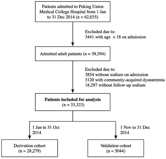 This single-center retrospective cohort study included patients admitted to Peking Union Medical College Hospital (Beijing, China) between 1 January 2014 and 31 December 2014. Patients aged 18 years or older, with at least two serum sodium measurements and with normal serum sodium at admission, were included in this study. Patients without serum sodium measurement within 24 h after admission were excluded from the analysis. All of the admissions were examined for the patients with several hospital admissions. Predictors of in-hospital mortality were determined from an initial derivation cohort consisting of data from 1 January to 31 October 2014. The validity of the model was then independently assessed using data from the second validation cohort, consisting of the subsequent hospitalization episodes from 1 November to 31 December 2014.