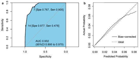 In-hospital mortality ranged from 0.106% (23/21,676) in the low-risk group to 8.463% (87/1028) in the high-risk group in the derivation cohort and from 0.049% (2/4079) to 8.403% (10/119) in the validation cohort (Table 4). The discrimination of our scoring system performed well in the validation cohort with an AUC of 0.932 (95% CI: 0.895–0.970), as shown in Figure 2a. The calibration plot demonstrated robust predictive performance with a close agreement between observed and predicted mortality (Figure 2b). In the subgroup analysis, 4056 patients in the validation cohort had hyponatremia during hospitalization. CARDS predicted in-hospital death with an AUC of 0.940 (95% CI 0.891–0.990) in the hyponatremia subgroup. While in the hypernatremia subgroup, CARDS predicted mortality with an AUC of 0.931 (95% CI 0.882–0.979) in 4742 patients.
