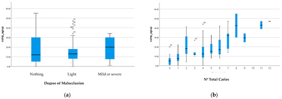 Relationship between degree of malocclusion and (a) number of total caries and (b) final COHIP score14.