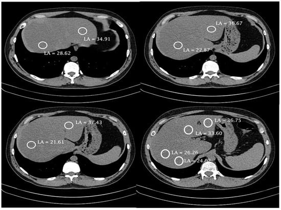 Liver steatosis was detected on chest or abdomen CT imaging and quantified by use of the liver attenuation coefficient measured in four sites of the liver parenchyma (two measures in the right lobe, one in the right-to-left lobe transition, and one in the left lobe) during the non-enhanced phase, as shown in Figure 1. The contrast is a confounding effect because it alters hepatic density, and there are no cut-off density value parameters that allow for characterizing steatosis in a post-contrast study. The most homogeneous areas of the liver parenchyma were chosen, avoiding vessels, the biliary tract, and focal liver lesions []. Later, the arithmetic mean of the four measures was calculated. Mean attenuation coefficient values ≤ 40 Hounsfield units were considered indicators of SLD [,].