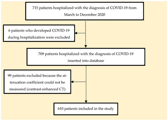 This study selected 715 patients hospitalized with a diagnosis of COVID-19, of whom 6 who developed COVID-19 during hospitalization and 99 who underwent chest CT with venous contrast enhancement, which hindered the assessment of hepatic steatosis, were excluded, as shown in Figure 2.