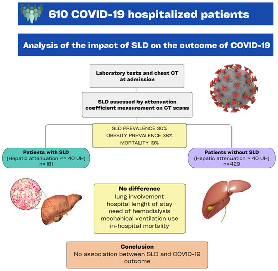 Few studies have investigated the impact of SLD on COVID-19 clinical presentation and outcome by using CT imaging for its diagnosis through the attenuation coefficient calculation [,,,,,,]. Most of those studies have identified an association between SLD and COVID-19 severity, a finding that differs from ours. However, the populations and methodologies used were different from those of the present study [,,,,,]. Zhou-Y-J et al. [], for example, have shown a correlation between the presence of SLD and a high severity of COVID-19. However, the population of that study comprised patients under the age of 60 years, thus, younger than ours, and no mortality data were reported. A Chinese case–control study [] compared 587 patients hospitalized due to COVID-19 (cases) with 587 non-hospitalized patients who had undergone chest CT in the year preceding the pandemic due to other reasons (controls). That case–control study found a longer hospital length of stay and higher severity of lung involvement, but no relation to mortality, in the group with SLD as compared to the group without SLD. Another limitation was that both groups (cases and controls) underwent tests for the diagnosis of SLD in different occasions, which might have hindered the analysis of the results.