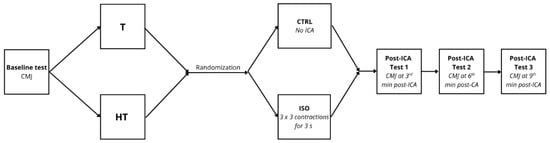 Study design flowchart. T—group consisting of trained participants; HT—group consisting of highly trained participants; CMJ—countermovement jump; ICA—isometric conditioning activity; CTRL—control condition (without ICA); ISO—isometric muscle action condition with total ICA duration of 27 s in 3 sets.