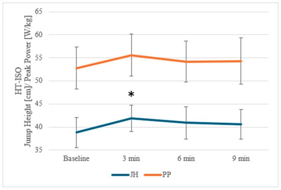 Changes in jump height (cm) and peak power (W/kg) over time—HT-ISO. HT-ISO—group consisting of highly trained participants with isometric muscle action condition with total ICA duration of 27 s in 3 sets; 3 min—3rd minute post-ICA, 6 min—6th minute post-ICA, 9 min—9th minute post-ICA; JH—jump height (cm); PP—peak power (W/kg); *—significant difference compared to baseline value and the 3rd-minute post-ICA within the same condition, p < 0.05.