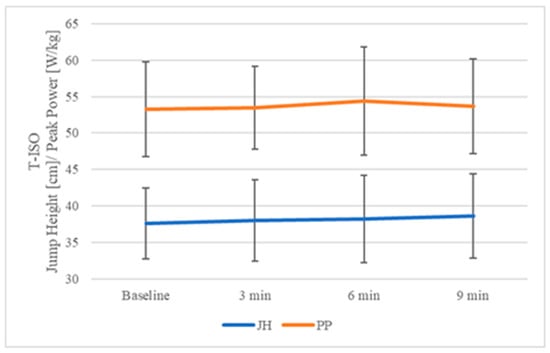 Changes in jump height (cm) and peak power (W/kg) over time—T-ISO. T-ISO—group consisting of trained participants with isometric muscle action condition with total ICA duration of 27 s in 3 sets; 3 min—3rd minute post-ICA; 6 min—6th minute post-ICA; 9 min—9th minute post-ICA; JH—jump height (cm); PP—peak power (W/kg).