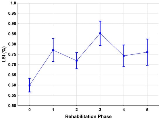 The analysis of the functional results using the Lim Symmetry Index showed continuous improvement over the course of the rehabilitation period. Between phases 0 and 2, the mean LSI score increased significantly from 0.64 ± 0.02 to 0.81 ± 0.01 (p < 0.001) (Figure 2). The elapsed time since surgery proved to be a significant positive predictor of functional development (p = 0.034). Conversely, there was a strong negative effect of pain (measured on the VAS) on performance (p < 0.001). Height and weight had no significant effect on the test results (Table 2).
