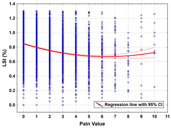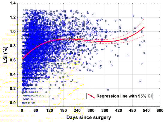 There was a significant influence of time on the functional values (Figure 3) and the pain level during the exercises (Figure 4). Here, the rapid improvement in the early rehab phases in the first 150 days can be visualized particularly well, as well as the negative correlation of the pain value also in the early rehab phases. Figure 4 illustrates the progressive decline in pain intensity with higher LSI, with the steepest reduction occurring in the early rehab phases. Clinically, this emphasizes the critical importance of early pain management strategies to facilitate functional recovery.