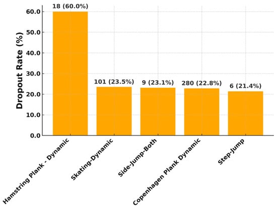 The top five exercises with the highest drop-out rates are demonstrated in Figure 5. Different absolute frequencies result from the fact that the exercises are tested with different frequencies and according to the algorithm in different rehab phases. Figure 5 shows dropout rates per exercise type, with high attrition observed in all these types of complex exercises. This indicates that some advanced tasks may require modification or gradual introduction to avoid patient demotivation.