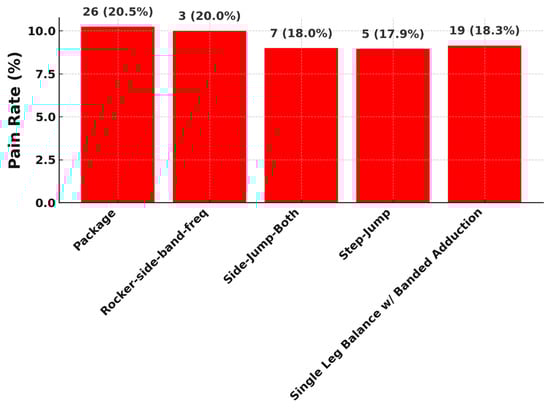 All of the listed exercises involve multi-joint, load-bearing movements with either dynamic instability or unilateral loading, which are known to provoke higher neuromuscular demand. Exercises like the Step Jump and Side Jump Both involve rapid plyometric motion and sudden load deceleration, which can aggravate discomfort particularly in patients recovering from anterior cruciate ligament reconstruction (ACLR) or other post-surgical knee states. Prior studies indicate that jump-landing tasks are frequently associated with elevated joint forces and increased muscle co-contraction around the knee, both of which contribute to higher pain perception during rehabilitation [,]. The Single Leg Balance with Banded Adduction, despite its apparent simplicity, requires deep hip and core activation while challenging proprioception and stability. The use of elastic resistance bands intensifies the adduction load and can strain recovering tissues, especially in patients with deficits in gluteal strength or neuromuscular control []. Similarly, Rocker Side Band-Frequent is characterized by repetitive lateral movement with band resistance, stressing the lateral kinetic chain, which can provoke discomfort due to the constant tension and low-level isometric hold requirements. Exercises like Package-which may involve a compound or novel movement pattern-are often rated painful because they lack individualized progression schemes and may not be well aligned with patients’ current functional levels. Evidence suggests that poorly timed progression or lack of personalization in rehabilitation programming increases the likelihood of overexertion and pain flare-ups [].