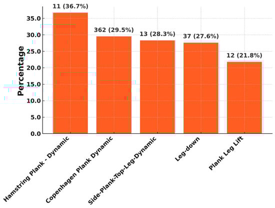 In addition, five exercises were identified with the highest pain values (each around 20%) are demonstrated in Figure 6.