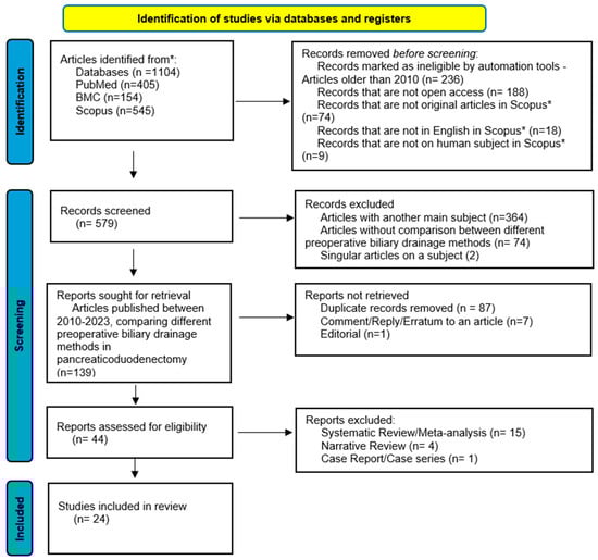 We conducted an electronic search for original articles indexed in PubMed, BMC, and Scopus databases. Eligibility criteria were restricted to studies published in English and conducted on human subjects. The literature search was conducted in two major English-language databases (MEDLINE via PubMed and Scopus) and one additional database (BMC), which together comprehensively index the vast majority of high-quality peer-reviewed studies in this field. A preliminary scoping search did not identify further eligible studies in other databases or languages. This approach was designed in accordance with the PRISMA 2020 guidelines (Supplementary Material S4). To ensure relevance to contemporary clinical practice, we limited the inclusion of studies to those published between January 2010 and December 2023. This timeframe was selected based on several considerations: (1) significant advancements in endoscopic and percutaneous drainage techniques, devices, and perioperative care have occurred since 2010; (2) a pivotal randomized controlled trial by van der Gaag et al. (2010) prompted a shift in clinical guidelines and practice patterns regarding preoperative biliary drainage; and (3) older studies risk introducing methodological and clinical heterogeneity due to outdated protocols and equipment [].