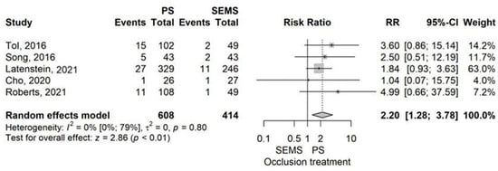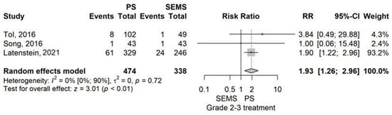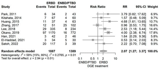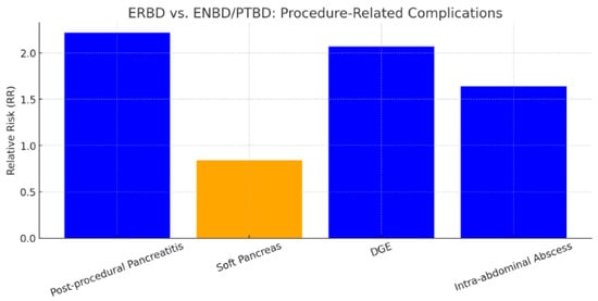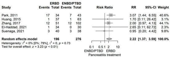 Pancreatitis rate had demonstrated a higher rate in the ERBD group compared to ENBD/PTBD with an RR value of 2.22 (95% CI 1.37–3.59), p = 0.001 using the model with random effects (Figure 2).