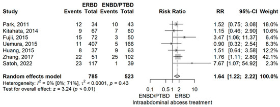 ERBD group compared to the ENBD/PTBD group, demonstrated a higher rate of intraabdominal abscess with an RR value of 1.64 (95% CI 1.22–2.22), p = 0.001 using the model with random effects (Figure 3).