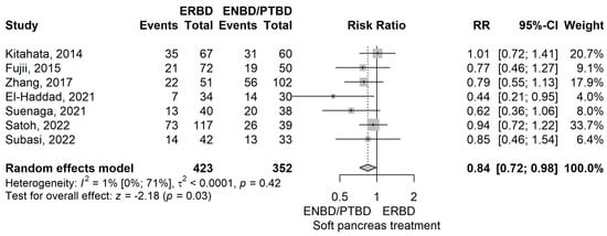 Meta-analysis indicated a slightly higher risk of POPF for the ERBD group compared to the ENBD/PTBD group (RR = 1.29), but the difference was not statistically significant (p = 0.168).