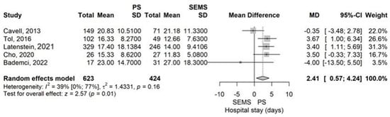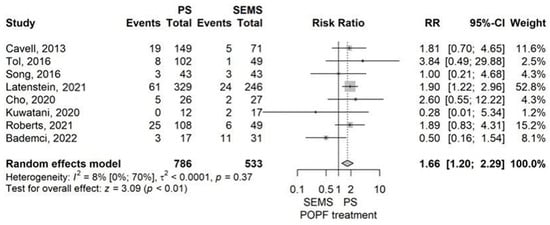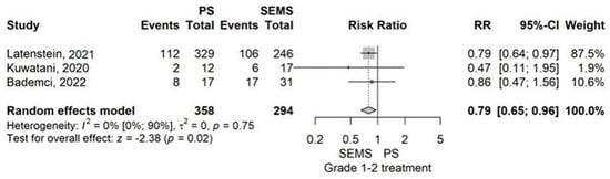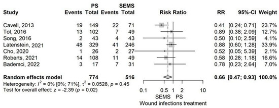Most studies had similar groups according to age, sex distribution, type of operation, histological type of the tumor, and percentage of neoadjuvant treatment, with some exceptions. The age of the patients was higher in the group with internal drainage (ERBD) than in the external drainage group (ENBD/PTBD) in a study by Okano et al. in 2019 []. The percentage of male patients was higher in the ERBD group than in the ENBD group in the study by Satoh et al. from 2022 []. The ratio of pylorus-preserving pancreaticoduodenectomy (PPPD) to pancreaticoduodenectomy (PD) was higher in the ERBD group than in the PTBD group in two studies (Lee et al. from 2018 and Byun et al. from 2021) [,]. In a retrospective cohort study conducted in 2014, Kitahata et al. compared internal drainage (ERBD) and external drainage (PTBD/ENBD) and showed a statistically significant difference between the PD/PPPD/Pylorus resecting pancreaticoduodenectomy (PRPD) ratio, with a much higher rate of PRPD in the ERBD group []. The percentage of histological type of ductal adenocarcinoma of the pancreas was higher in the SEMS group than in the PS (Latenstein et al., 2021), and in the PTBD group than in the ERBD group (Lee et al., 2018) [,]. Neoadjuvant treatment was more prevalent in the SEMS group than in the PS group in 3 studies (Latenstein et al., 2021, Roberts et al. 2021, Cavell et al. 2013) [,,]. In the studies that considered the intraoperative characteristics of the main biliary duct diameter and the percentage of patients with soft texture of the pancreas, there was homogeneity between the studied groups, except for Latenstein et al., 2021, where the group drained by PS had a much higher incidence of soft pancreas than the group that underwent preoperative biliary drainage by SEMS []. Adding the above exceptions marks a clinical heterogeneity among groups that requires utilizing the model for random effects.