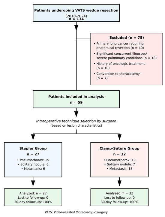 Between 2018 and 2024, a total of 134 patients underwent VATS wedge resection at our institution. Based on the predefined exclusion criteria, 59 patients were included in the study. Excluded patients consisted of those diagnosed with primary lung cancer requiring further anatomical lung resection (n = 40), patients with significant concurrent illnesses or severe pulmonary conditions (n = 18), those with a history of oncologic treatment (n = 10), and cases requiring conversion to thoracotomy (n = 7).