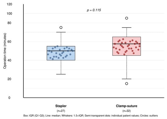 Operative time comparison between surgical techniques with overlaid individual patient data. Box plots show the distribution of operative times for stapler (n = 27) versus clamp–suture (n = 32) groups in VATS wedge resection. Semi-transparent dots represent individual patient values, demonstrating within-group variability. No significant difference was observed between groups (p = 0.115). Box: IQR (Q1–Q3); line: median; whiskers: 1.5 × IQR; semi-transparent dots: individual patient values; circles: outliers.