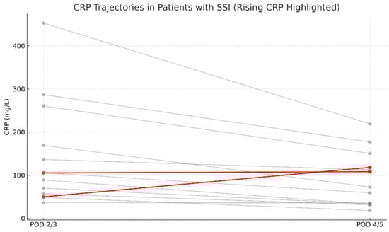 Individual serum CRP trajectories in patients with early surgical site infection (SSI) between postoperative days (POD) 2/3 and 4/5. Red lines indicate patients with rising CRP levels, suggestive of ongoing or worsening infection. Grey lines represent patients showing a typical postoperative CRP decline.