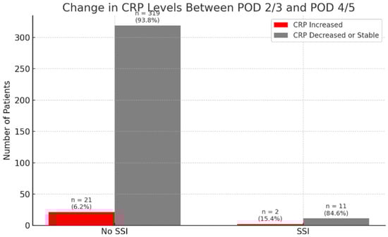 Distribution of patients with and without early SSI according to changes in serum CRP concentrations between postoperative days (POD) 2/3 and 4/5. Red bars indicate patients with an increase in CRP levels; grey bars indicate stable or decreasing values.