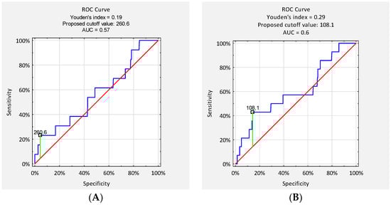Receiver operating characteristic (ROC) curves for serum CRP concentrations on (A) postoperative days (POD) 2/3 and (B) POD 4/5 in the entire study cohort. AUC: area under the curve. Colors: blue—ROC curve; red—no-discrimination reference line; green—proposed cut-off value (Youden index).