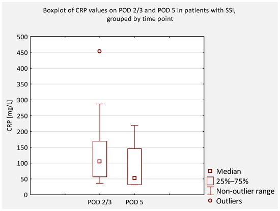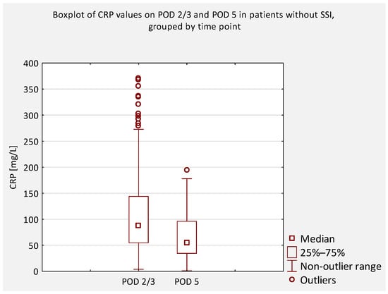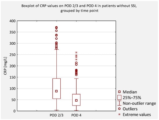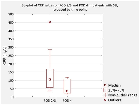 Boxplot of serum CRP concentrations on POD 2/3 and POD 4 in patients without SSI. A significant reduction was observed (p < 0.0001), consistent with the expected postoperative decline. Outliers indicate individual variability.