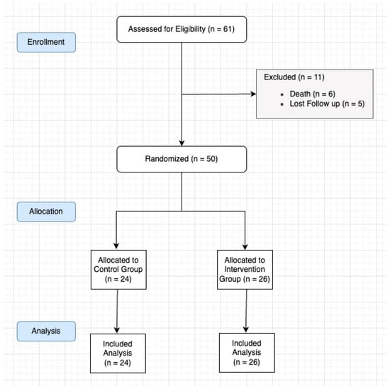 During the study period, 61 patients were initially followed up with. Six patients had died, and five were excluded due to loss to follow-up. Consequently, the final cohort comprised 50 patients, with 24 randomly assigned to the CG and 26 to the IG (Figure 1).