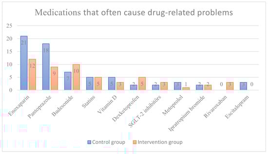 The active substances most frequently associated with DRPs were enoxaparin (33/167), pantoprazole (27/167), and budesonide (17/167), combining their frequencies across both groups. Specifically, in the CG, the leading agents causing DRPs were enoxaparin (21/167), pantoprazole (18/167), and budesonide (7/167), while in the IG, enoxaparin (12/167), pantoprazole (10/167), and budesonide (9/167) were identified as the primary causative agents. The distribution of other active substances based on the groups is visually presented in Figure 3.