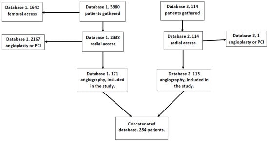 This was a single-center study, and the data were analyzed retrospectively. Two databases were concatenated and analyzed together. The first database was the subject of our previous study. From this database, 171 patients were recruited. The study for which the database was originally created did not need separate bioethical commission approval according to the regulator’s document KNW/0022/KB/69/18. The second database included 113 patients, the majority of whom (92%) did not receive heparin during the procedure upon the operator’s decision. To gather the data for this database, bioethical commission approval with the number PCN/CBN/0052/KB1/90/22 (20 September 2022) was obtained. Both databases were assembled at the 1st Department of Cardiology of the Upper Silesian Medical Center and covered the period from October 2016 to January 2018 and the period from September 2022 to October 2023, respectively. This study was performed on adults treated with a single antiplatelet agent. Exclusion criteria were an angioplasty with or without stent implantation and diagnostic studies requiring heparin (intravascular ultrasound; optical coherence tomography; fractional flow reserve). These patients were given heparin mandatorily and were not included in the study. The final number of patients included in the analysis was 284. The process of obtaining the data for the database is presented in the flowchart in Figure 1.