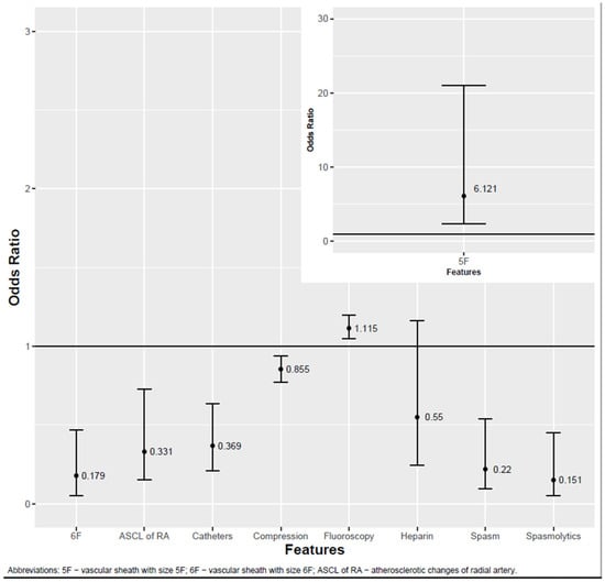 Of the 52 variables, 8 had a significant association with the occlusion. Of these eight variables, two had negative and six had positive associations. A longer fluoroscopy time (p < 0.001) and 5F vascular sheath (p = 0.001) were associated with lower chances of RAO. A greater number of catheters used (p < 0.001), greater compression time (p = 0.001), 6F vascular sheath (p = 0.002), spasm occurrence (p = 0.001), spasmolytic administration (p < 0.001) and atherosclerotic changes in the radial artery (p = 0.005) were associated with a greater risk of occlusion. Heparin administration (p = 0.131) was not associated with occlusion. The study did not find any significant association between RAO and patients’ chronic diseases or medical history. Anatomical features such as the origin of the brachial artery, RA diameter and pathological intima–media complex had no associations with the incidence of RAO. The crucial results are presented in Figure 2, whereas the results for all variables are presented in Table 3.
