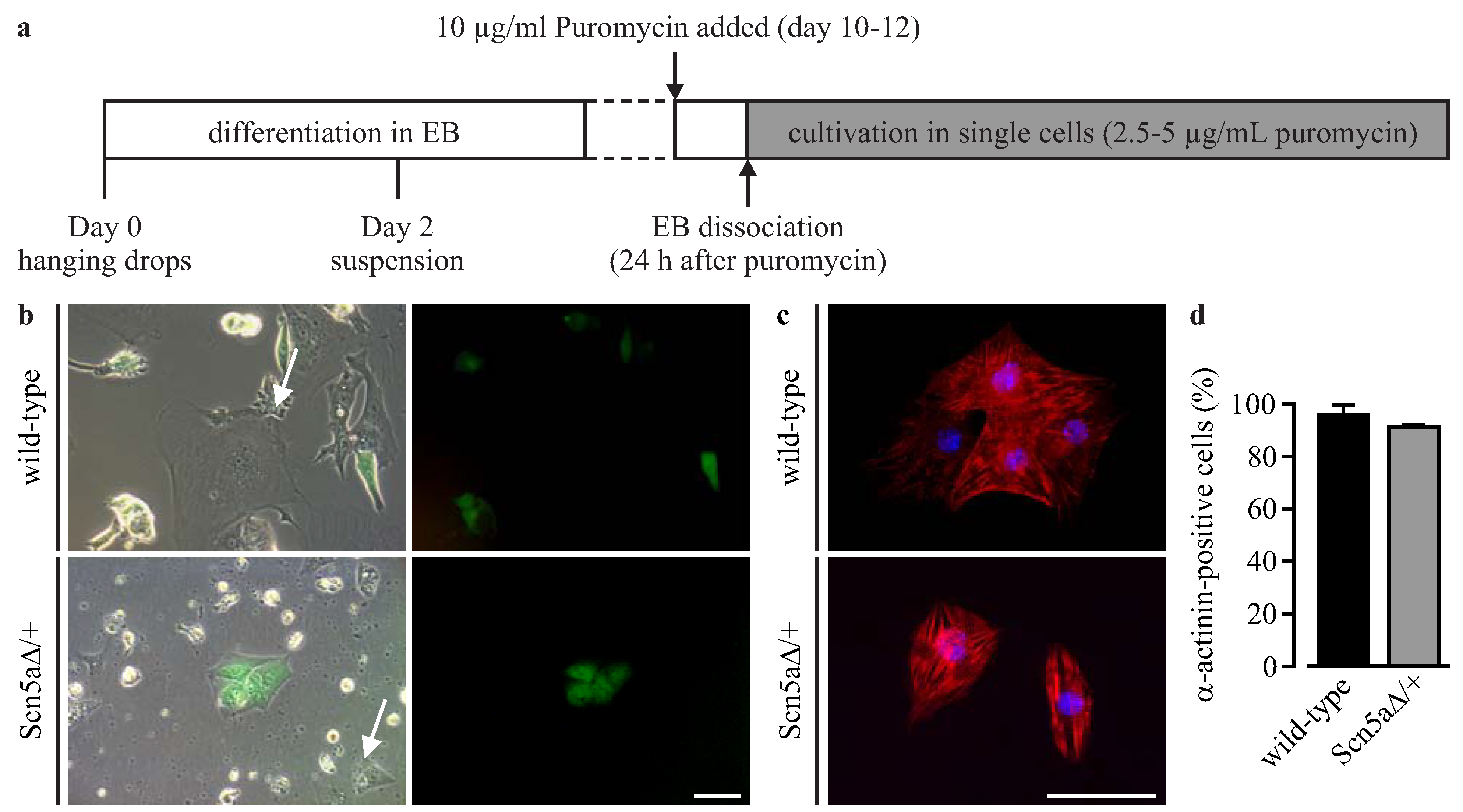 Purification of iPS cell-derived cardiomyocytes. (a) The cardiac differentiation protocol used in this study; (b) single dissociated cardiomyocytes were GFP-positive and beating, but some non-contracting and GFP-negative cells remained (arrows) after the puromycin selection for 24 h; (c) after further purification of single cells, mostly α-actinin-positive cardiomyocytes survived (red); (d) cell counting at Days 13 to 15 of differentiation showed the very high purity of wild-type and Scn5a∆/+ cardiomyocytes. Scale bars: 50 μm. Error bars: S.E.M. EB, embryoid body.