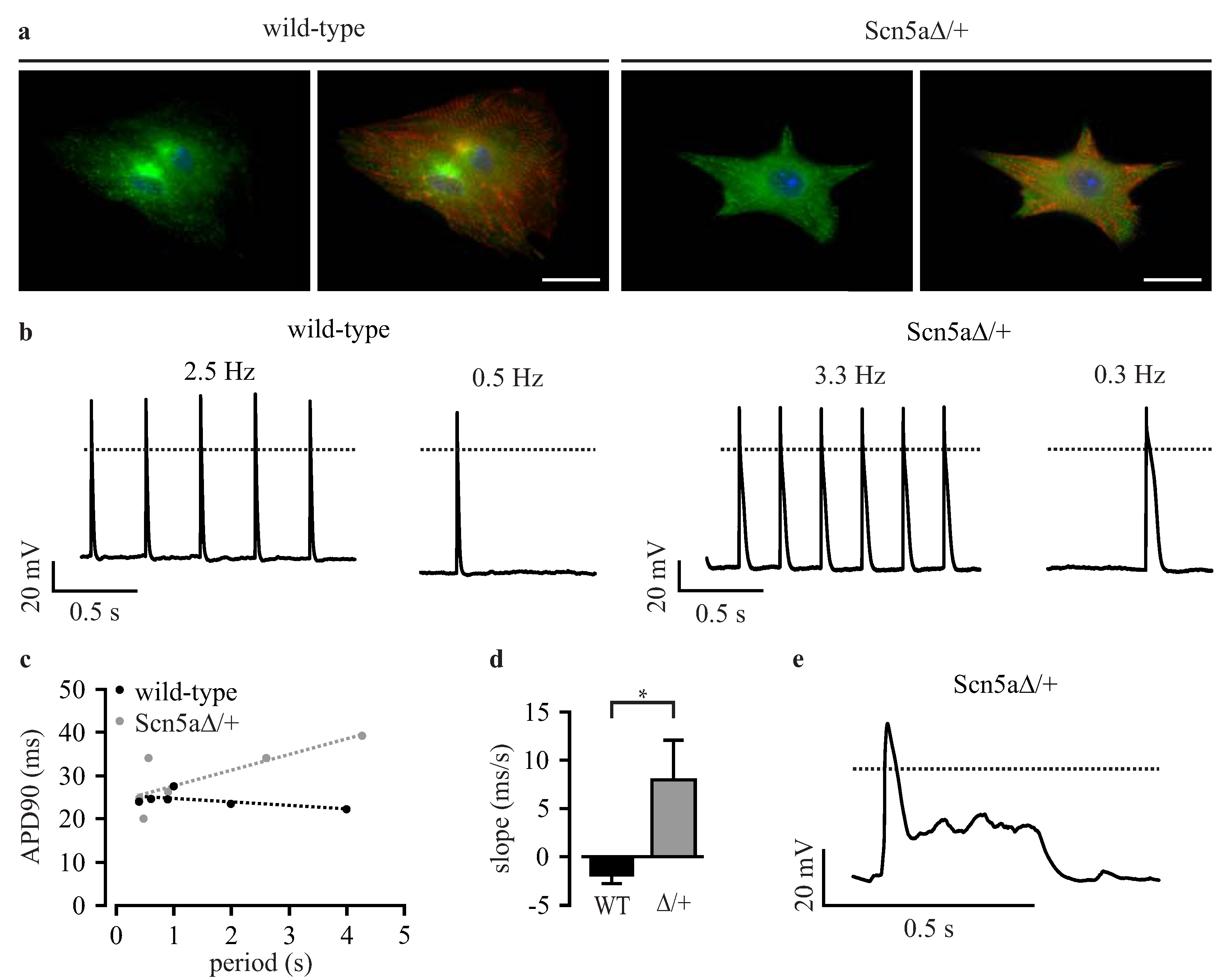Patch clamp analysis of purified iPS-derived cardiomyocytes. (a) Cardiomyocytes from wild-type and Scn5a∆/+ iPS cells showed a similar cardiac sodium channel distribution (green) and sarcomeric α-actinin pattern (red); (b) representative examples of action potentials (APs) from purified wild-type and Scn5a∆/+ cardiomyocytes at high and low pacing frequencies; (c) relationship between action potential duration at 90% of repolarization (APD90) and pacing period from a representative wild-type and Scn5a∆/+ cardiomyocyte with the analysis of the slope by linear fit (dashed lines); (d) statistical analysis of the slope of APD90 to the pacing period relationship from individual wild-type (WT) and Scn5a∆/+ cardiomyocytes (∆/+); (e) typical long QT syndrome 3 (LQTS 3)-specific early afterdepolarizations (EADs) observed in a Scn5a∆/+ cardiomyocyte. Scale bar: 20 μm. Error bars: S.E.M. Dotted lines indicate 0 mV.